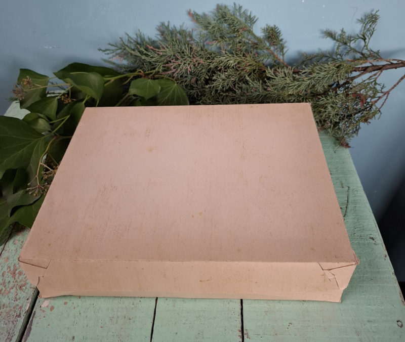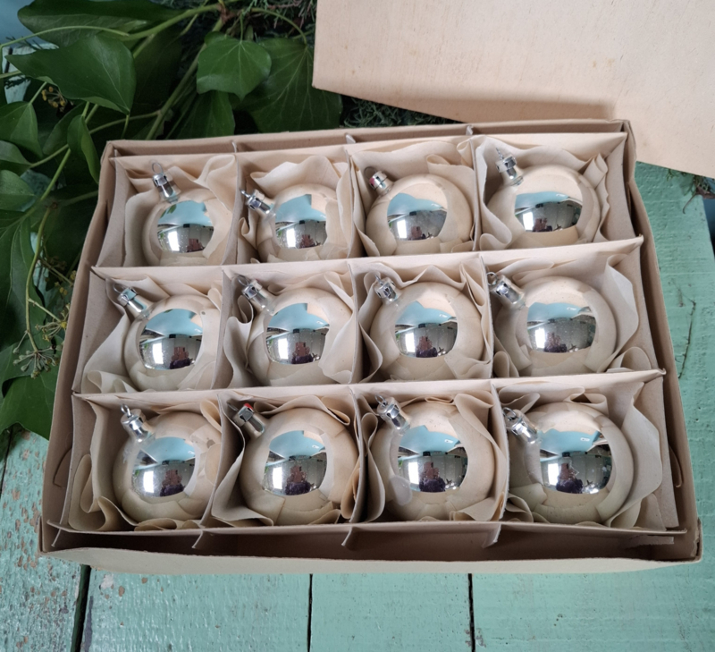 Originele doos met deksel met 12 vintage kerstballen. De ballen hebben een doorsnede van 6cm. Ze hebben normale vlekjes door hun leeftijd. De prijs is voor de doos met 12 ballen.