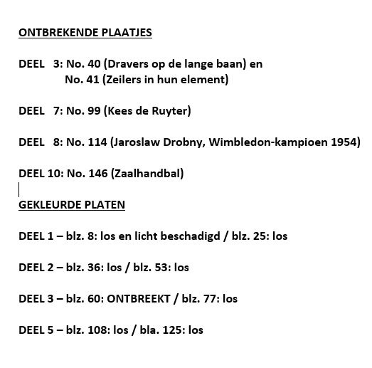 Conditie: redelijk-goed; lichte gebruikssporen; NAW-gegevens op schutblad (DEEL 1) en op binnenkaft (DEEL 2, 3, 4 en 5); 5 plaatjes en 1 gekleurde plaat ONTBREKEN (zie afb.)