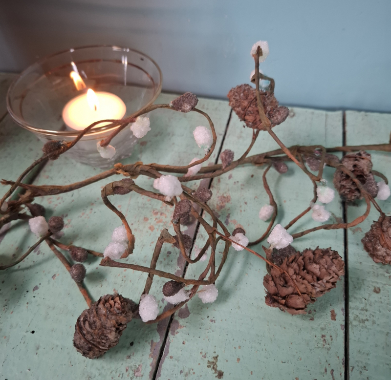 Een heel leuke brocante kersttak, gemaakt van ijzerdraad omwikkeld met papier. In brocante staat. De lengte is ongeveer 90 cm.