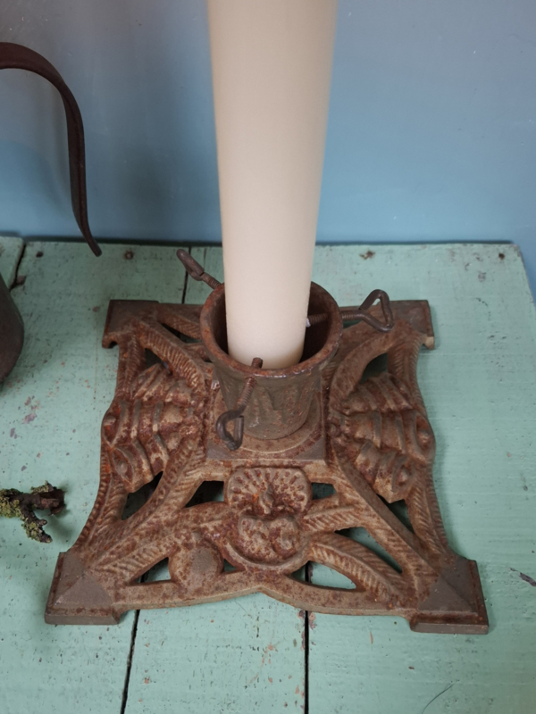 Oude gietijzeren kerstboomstandaard met mooi patina. Voor een kerstboompje, mooie tak of een dikke kaars. De afmetingen zijn 20 x 20 x 10 cm. Ex. kaars
