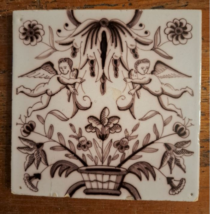 Antieke tegel – mangaan, engelen, bloemen – 18e/19e eeuw