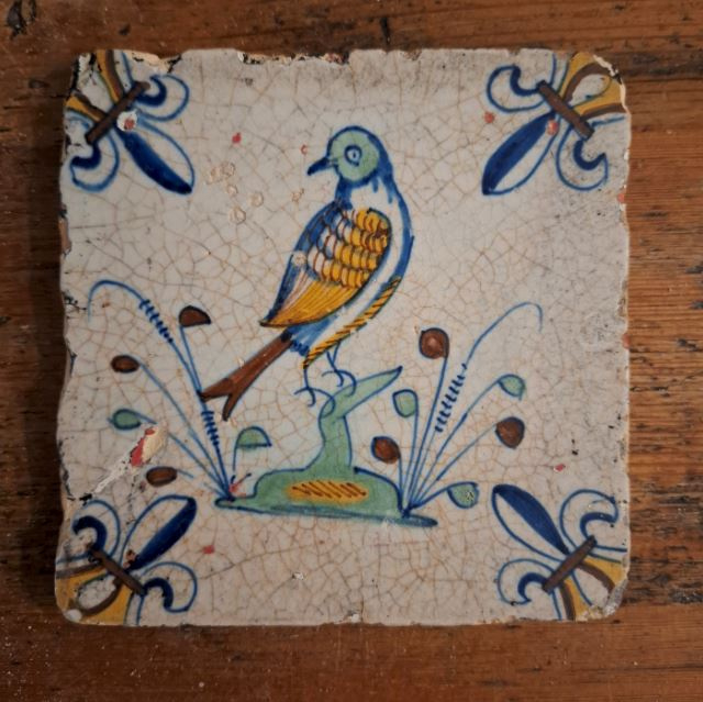 Antieke tegel – Delft - vogel, hoekmotief franse lelie – ca. 1640