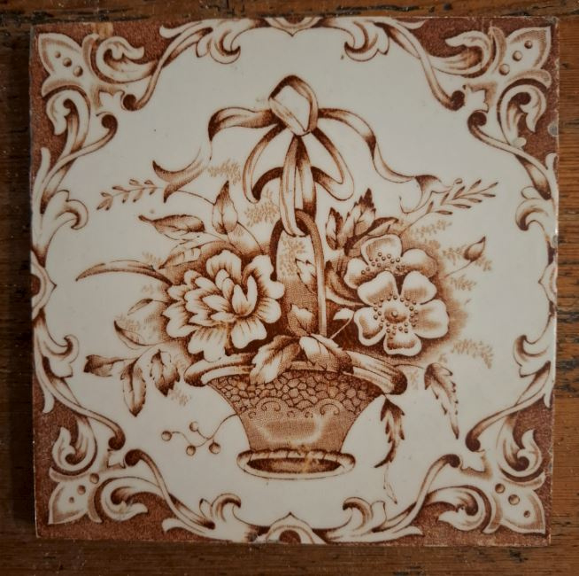 Antieke tegel - bruin transfer-ware decor van een bloemenmand