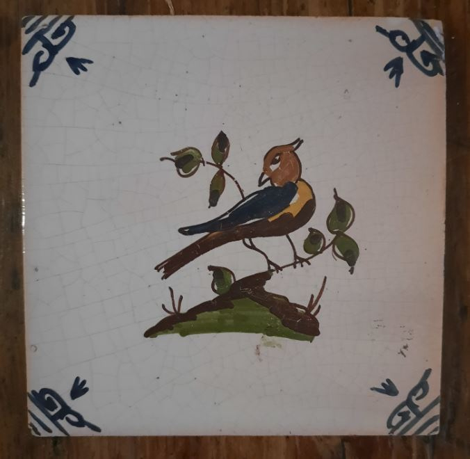Antieke tegel – Delft - handgeschilderde vogel op een tak - 1