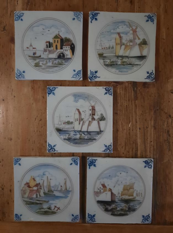 Elke tegel toont een uniek tafereel, zoals een molen, schepen of gebouwen aan het water