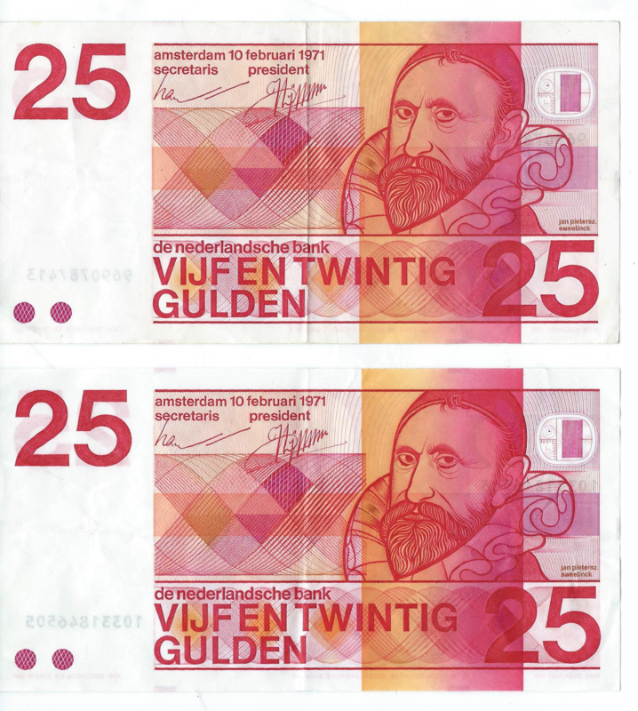 VIJF EN TWINTIG GULDEN – 2 stuks - 1971