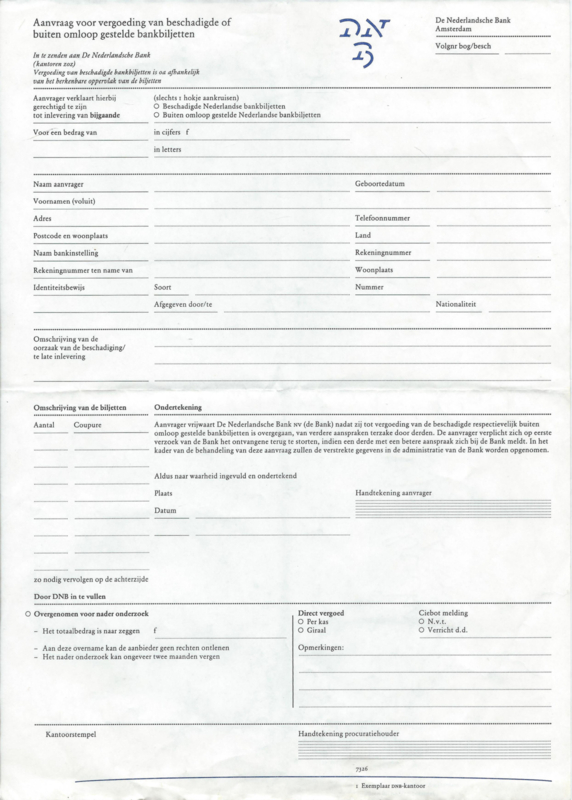 EXTRA: ongebruikt oud (ƒ) formulier ‘Aanvraag voor vergoeding van beschadigde of buiten omloop gestelde bankbiljetten’