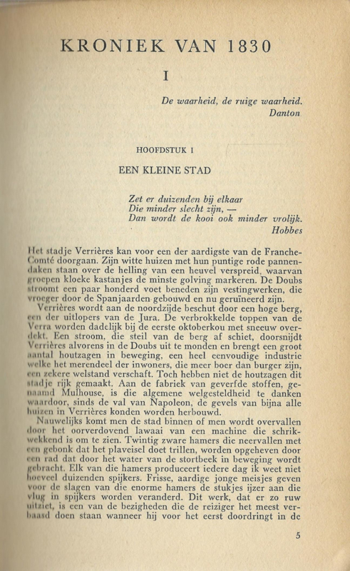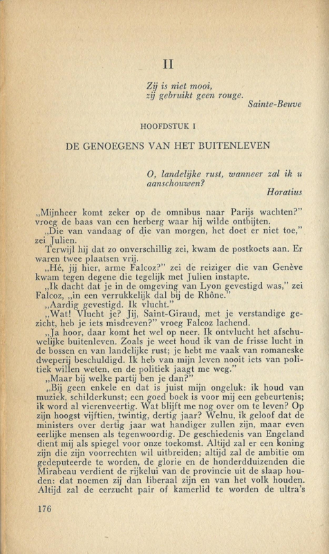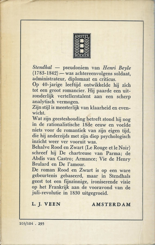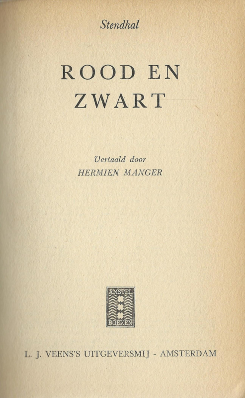 Oorspr. titel: LE ROUGE ET LE NOIR (1830); vertaald uit het frans door Hermien Manger; Deel I – blz. 5 t/m 176; Deel II – blz. 177 t/m 386