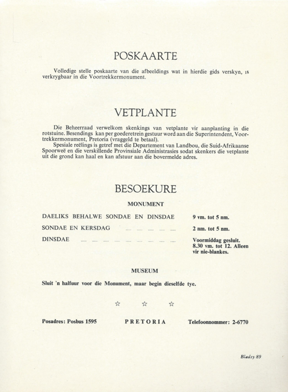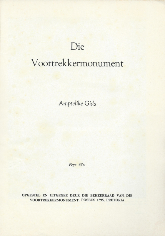 Uitg.: OPGESTEL EN UITGEGEE DEUR DIE BEHEERRAAD VAN DIE VOORTREKKERMONUMENT, PRETORIA - jaren ’60-‘70