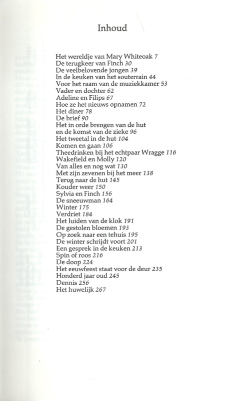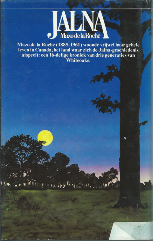 Opm.: De Jalna-serie bestaat uit zestien romans (in de uitgave van Het Spectrum uit 17 delen (deel 8 en 9 werden oorspronkelijk als een deel uitgegeven)) die het verhaal vertellen van de Canadese familie Whiteoak van 1854 tot 1954, hoewel elk van de romans ook als een onafhankelijk verhaal kan worden genoten. Voor een overzicht van de delen: zie afbeelding