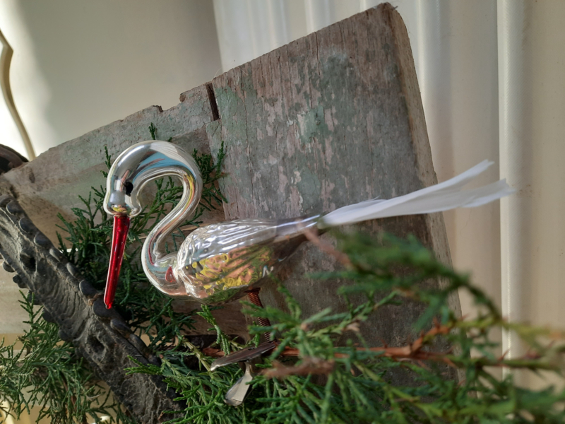 Zilverkleurige zwaan met rode snavel en veren staart. Hij is ongeveer 13,5 cm. lang en 10 cm. hoog incl. clip.