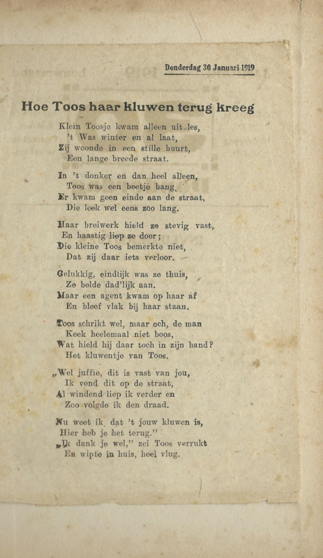 Opm.: gedicht ‘Hoe Toos haar kluwen terug kreeg’ (Donderdag30 Januari 1919) geplakt op binnenzijde achterkaft