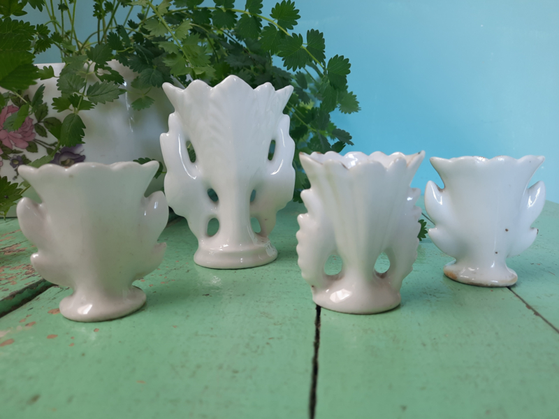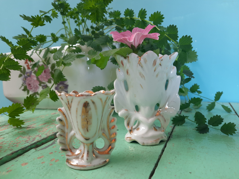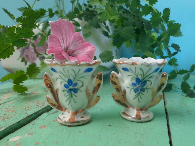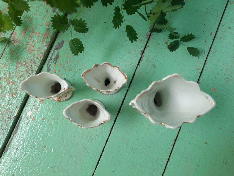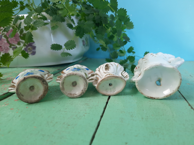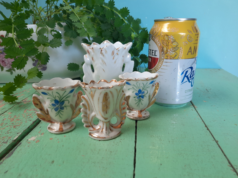 Zo leuk! Deze 4 antieke minivaasjes, decoratief maar ook leuk in b.v. een poppenhuis. Zet er een bosje droogbloemen of veertjes in of laat ze gewoon leeg. De vaasjes met blauw decor zijn 5 cm. hoog, de kleine in wit- goud is 5,5 cm. hoog en de grootste is 8,5 cm. hoog. Het goud van alle vaasjes is gesleten, maar dat is niet vreemd op deze leeftijd. De prijs is voor 4 vaasjes.