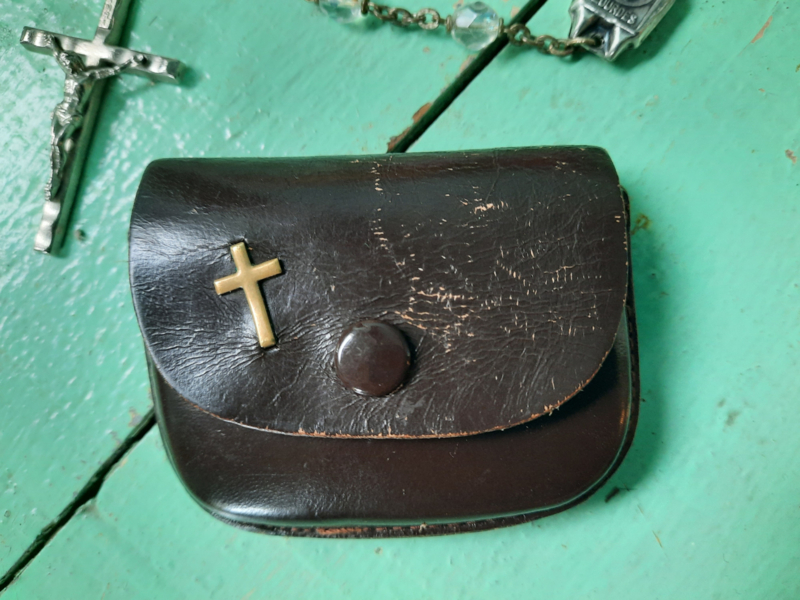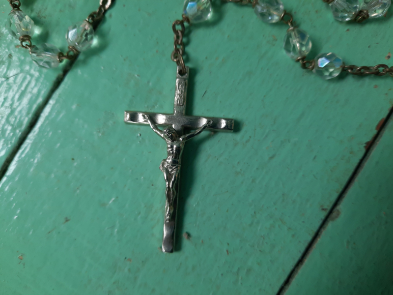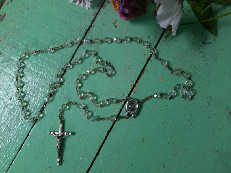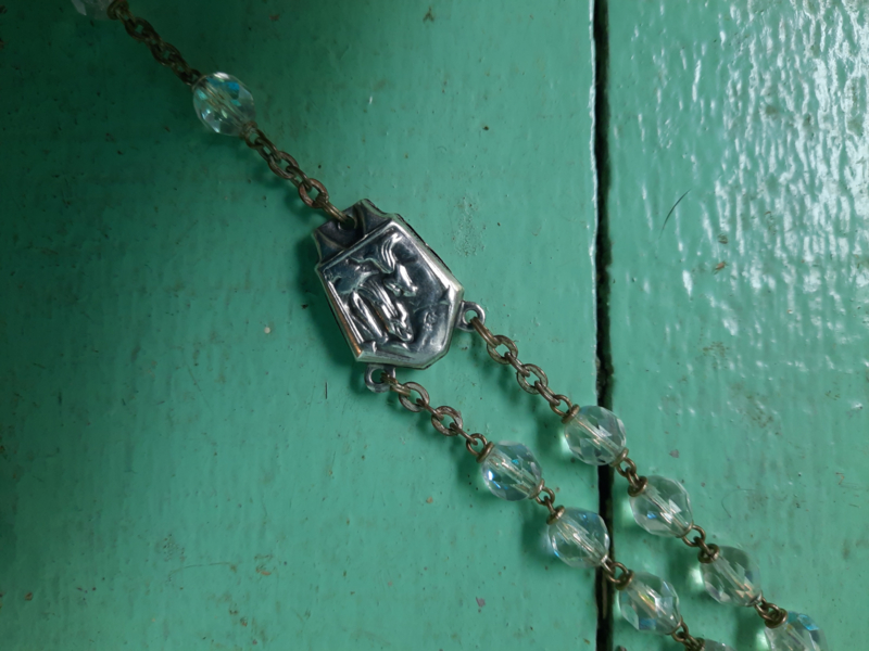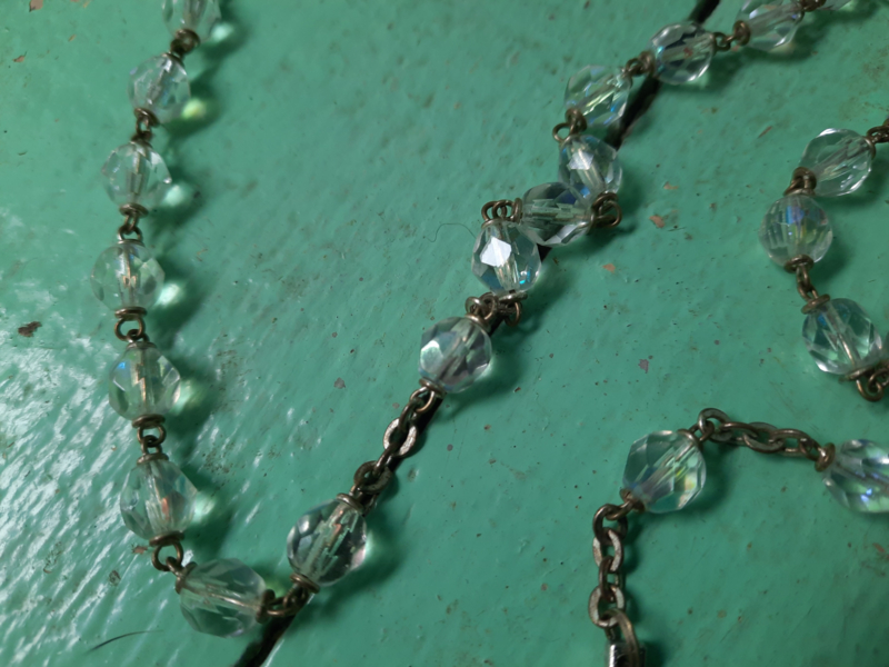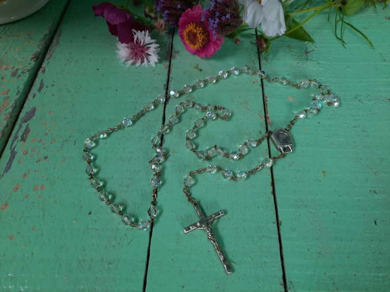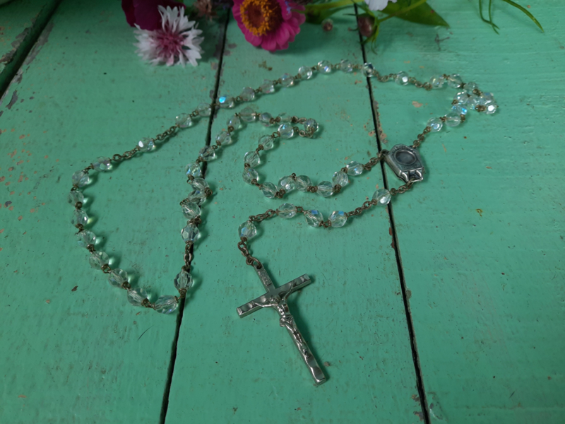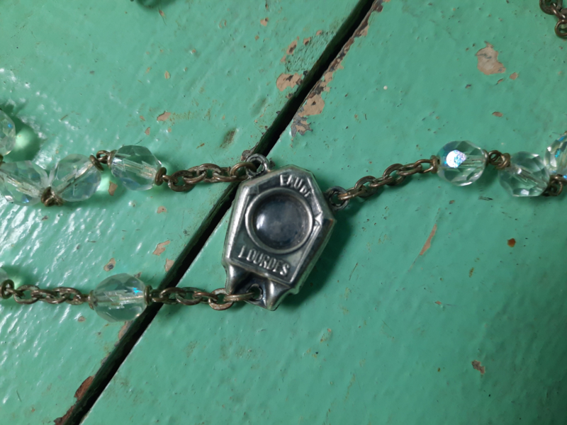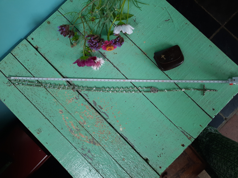 Prachtige rozenkrans, ook wel paternoster genoemd, met kristallen kralen. Ook zit er een relikwie aan, het glas daarvan is dof door het gebruik. Prachtig in je huis of om altijd bij je te dragen. Compleet met donkerbruin foudraal met daarop een metalen kruisje.