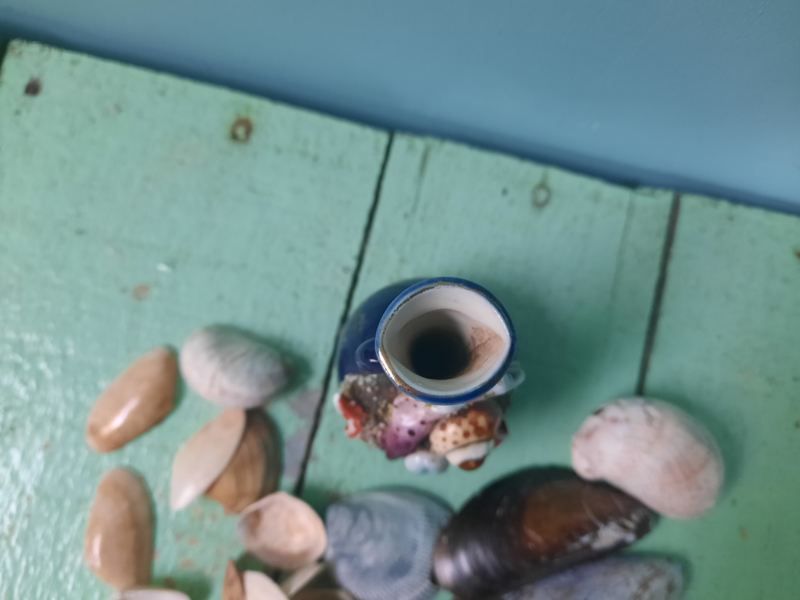 Mini vaas gedecoreerd met schelpen en koraal. Het vaasje is blauw met wat goudkleurige stipjes en de decoratie heeft veel verschillende kleuren. De kleur van de tak in de decoratie is wat gesleten. De hoogte van het vaasje is 8 cm.