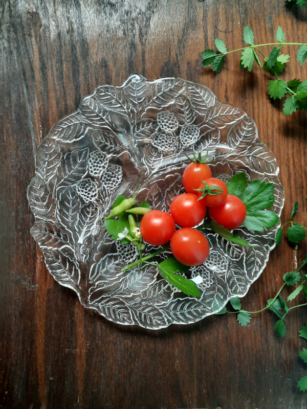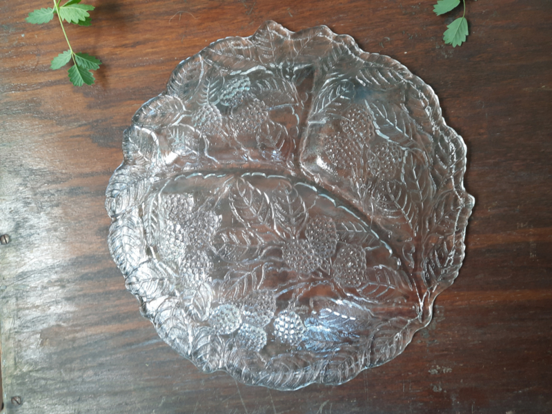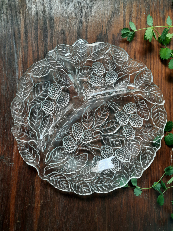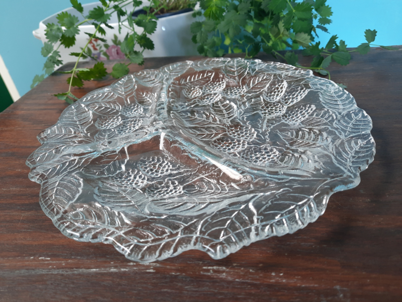 Een serveerschaal van dik glas met moerbeimotief, deze zie je niet vaak! De schaal is verdeeld in 1 groot vak en 2 kleinere. Een plaatje op tafel of in de keuken. De doorsnede is 22,5 cm. en de conditie is als nieuw.