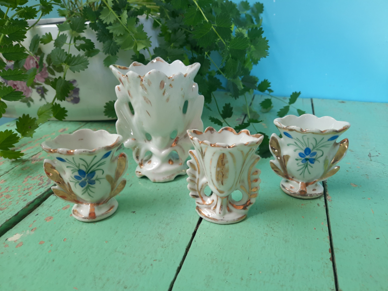 Antieke minivaasjesZo leuk! Deze 4 antieke minivaasjes, decoratief maar ook leuk in b.v. een poppenhuis. Zet er een bosje droogbloemen of veertjes in of laat ze gewoon leeg. De vaasjes met blauw decor zijn 5 cm. hoog, de kleine in wit- goud is 5,5…